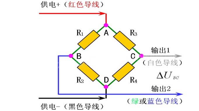 其中紅線是電源正,黑線是電源負,綠線和白線是信號輸出。這里輸出的信號是差分信號,電子稱重解決方案核心原理是將差分信號轉化為數(shù)字信號或0-20mA模擬信號,原理如下圖:
